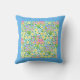 Una almohada muy bonito o un colchón con un patrón de primates rosa, amarillo y azul con un amplio borde azul turquesa, a partir de un diseño acuático pintado a mano por Judy Adamson.