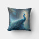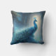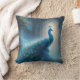 La imagen cuenta con un pavo real de colores vivos y una larga cola llena de cucharas oculares situada a la entrada de una avenida forestal. El pavo real se representa en tonos azules y verdes con toques de amarillo alrededor de las cucharas. El pájaro respira un suave resplandor que añade un ambiente místico. El entorno es un bosque denso con bruma que se cierne sobre el suelo y la luz que se filtra a través de los árboles. Una arcada de piedra ornamentada rodea la escena detrás del pavo real, lo que sugiere una entrada a un lugar encantado.