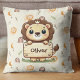 Esta adorable almohada personalizada de tiro muestra a un tierno y tierno león sosteniendo un cartel con el nombre de tu pequeño.
