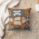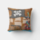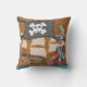 Un niño pirata de pelo rojo lleva un gorra con un loro sentado en el borde. Un barco pirata con canon y una bandera de calavera y cruces sobre una almohada que tu pequeño pirata seguramente ama.