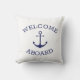 Bienvenida personalizado A bordo del Cojín decorativo blanco ancla azul marino . Letras azules de la marina fondo blanco, texto Personalizar náutico texto de vela, nombre del capitán, apellido, signo de entrada, etc genial para marineros, barcas, vela y navegación ¡Feliz navegación!