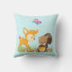 Una almohada con un bonito ilustracion con un ciervo y una ardilla sosteniendo una bellota y una mariposa sobrevolando sus cabezas. Estas adorables criaturas de los bosques sobre el césped con algunos hongos extravagantes a sus pies. Fondo azul claro.