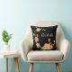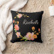 almohada de fondo negro con flores rosadas y verdes naranjas y monograma de nombre personalizado