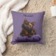 Un lindo personalizado negro y naranja tortoisesinfierno gatito se sienta cómodamente sobre un cojín morado contra un fondo morado.
