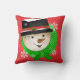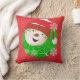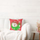 La almohada clásica de las vacaciones de los hombres de nieve, tan bonito y colorida, tiene un fondo rojo con pequeños puntos blancos de polka con un círculo verde con puntos blancos y cada lado tiene un muñeco de nieve sonriente con un gorra, bufanda, nariz de zanahoria y copos de nieve.