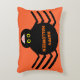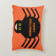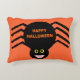 Esta impresionante almohada presenta una espeluznante araña negra con ocho piernas peludas, ojos amarillos con grandes pupilas negras y su boca abierta mostrando sus colmillos. Hay un texto naranja que dice "Feliz Halloween" y un antecedente naranja a juego.