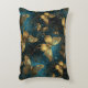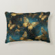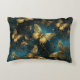 Una almohada de acento elegante con un patrón de mariposas en brillantes tonos dorados y tonos azules brillantes.