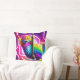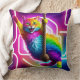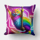 Este concepto de diseño muestra un lado de una almohada de dos caras, que representa a un gato colorido y vibrante con pieles brillantes colgando de una cuerda sobre un fondo de neón brillante en un estilo de arte 5D.