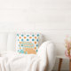 Una almohada tibia y colorida con tres elefantes en patrones, rayas de chevron y rayas diagonales de blanco, azul y naranja sobre un blanco con polka azul y naranja da fondo.