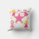 La almohada de las princesas de hadas rosas con una gran estrella rosada y cuatro princesas de hadas vestidas con vestidos rosas con mágicas varas sobre un fondo blanco.