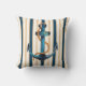 almohada de rayas náuticas con un diseño de ancla de acuarela en la parte delantera. La almohada decorativa de esta casa de playa se transforma en marfil, oro y rayas náuticas turquesas en la parte trasera.