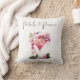 Elegantes Flores de Jardín con Copa de Champán, Frutas y texto "Pétalos y Prosecco" Tema Floral para Almohadón de Despedida de Soltera en colores lila, lavanda, rosa pálido, melocotón, albaricoque y verde.