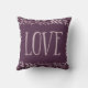 Flores y hojas rústicas con fondo morado y con la palabra "amor". Esta almohada rústica con chorros de flores es perfecta para el El día de San Valentín o sólo para una encantadora adición a su habitación de casa o dormitorio.
