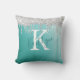Verde azulada almohada turquesa de poda acuática con fondo metálico cepillado y borde de goteo purpurina plateado personalizado con un nombre de guión inicial y manuscrito blanco en verde azulado. Un regalo ideal para los amantes del brillo o de la decoración de una habitación a la moda. Póngase en contacto con el diseñador a través de Zazzle Chat o makeitaboutyoustore@gmail.com si desea modificar este diseño, en otro producto o si desea coordinar elementos.