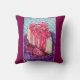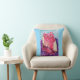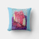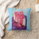 A slice of cake topped with vibrant red raspberries drips with rich sauce onto a dark purple plate. The background features a blue lattice pattern, complementing the dessert's vivid colors.
