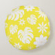 Un diseño floral blanco se sienta sobre un fondo amarillo brillante.