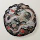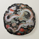 Esta almohada de tiro redondo presenta un par de dragones blancos de estilo asiático rodeados de flores sobre un fondo negro.