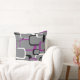 Un diseño divertido de cuadrados de inspiración retro, en color morado, negro y blanco, con un fondo gris sobre una almohada de tiro.