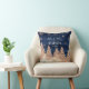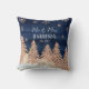 "Rosa oro brillo Navidad Bosque Sr y Sra Almohada." Fondo de madera lavado con azul marino rico con árboles del bosque con brillo rosa oro sobre una ladera nevada con tres ciervos y copos de nieve estilizados. Todo el arte creado por la artista y diseñadora internacionalmente licenciada, Audrey Jeanne Roberts, derechos de autor.