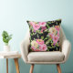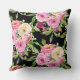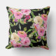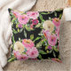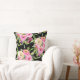 Rosas de acuarela exuberantes en tonos rosas, rojos, melocotón y crema con un fondo negro sobre esta almohada femenina de tiro.