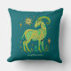 Almohada con una representación estilizada de una cabra, intrincadamente decorada con motivos verdes y amarillos, representando el signo zodiaco de Capricornio. Los elementos que lo rodean incluyen símbolos celestes y diseños de hojas.