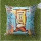 Una almohada exterior decorada con una representación abstracta de la puerta. Las aguas se agitan en los cultivos azules y orgánicos forman un paisaje de éxito.