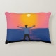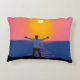 Saludo al sol. Un hombre está parado en una playa frente al mar abierto y saludando al sol amarillo con los brazos levantados.