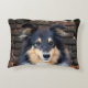 Hermosa Sheltie tricolor, o Sheepdog de Shetland, cara en un fondo de ladrillo muy colorido adoradores de acento almohada