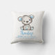 Custom throw pillow, featuring a cute teddy bear, trimmed in blue. Makes a thoughtful personalized new baby gift. Add your baby's name and birth details by following the "Personalize this template" prompt. You can also edit the text and color, if you wish.
