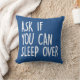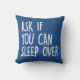 Esta almohada divertida y extravagante presenta la pregunta que todos hicimos cuando éramos niños: "Pregúntenle si puede dormir por encima". Es un guiño juguetón a las dormilones infantiles, rogando a nuestros padres que nos dejen pasar la noche en la casa de nuestros amigos o primos. Personaliza la espalda para hacerlo aún más especial! Disponible en el vibrante Royal y Hot Pink, esto hace un gran regalo divertido para que los niños se regalen unos a otros. Perfecto para cualquier habitación infantil o como regalo para los amantes de las carreras de sueño.
