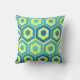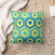 Esta almohada de tiro tiene un diseño geométrico de hexágonos en cuatro tonos azules sobre un campo de rayas amarillas en dos tonalidades.