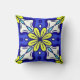 Square throw pillow with yellow flowers against a blue background.