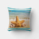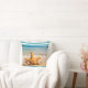 Una almohada con una bonita fotografía de una estrella de mar colocada en la arena. Debajo de sus brazos hay dos pequeñas conchas que descansan cómodamente. Está situado en una playa con olas que rompen en el fondo.