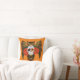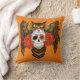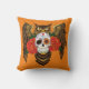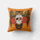 Un gran búho de cuernos marrones con un día de cráneo de azúcar muerto y rosas rojas en un telón de fondo de naranja.