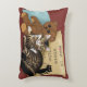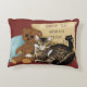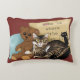Un gatito de tabby se acurrucó hasta su osito de Teddy sobre un sofá con almohadas en un fondo de burdeos