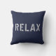 Almohadón con letras "Relax" en tipografía urbana blanca moderna sobre fondo azul oscuro.
