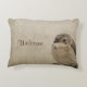 Una almohada adorable que dice Bienvenida a un lado y Siéntese al otro.