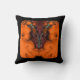 Esta dramática almohada de tiro decorativa presenta un diseño fractal abstracto de un espíritu vudú en tonos rojos, negros, verdes y azules. Sus cuernos son azules y está rodeado por una brillante nube gaseosa naranja. La imagen se repite en la parte posterior.