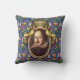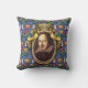 The Bard - La obra de arte original de ZoeSPEAK sobre este Cojín decorativo muestra un retrato del autor William Shakespeare. El retrato está en un marco dorado oval ornamentado con cintas y una corona encima. El fondo azul de la pared está decorado con castillos, coronas de reyes y flores amarillas y rojas, recordando el romance, la tragedia y la comedia de sus obras y poesía.