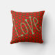 Cushion rojo y verde tiene la palabra "Amor" con un patrón de Corazones rojos como fondo repitiendo.