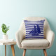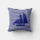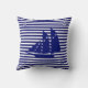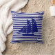 Elegante y moderno yate azul sobre Cojín decorativo de rayas azules blancas.