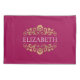 Un elegante estuche de almohadas de monograma rosa y dorado floreciente. Añade tu nombre entre el florecimiento floral de oro en la parte delantera. Diseñado para ti por Blackberry Boulevard.
