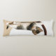 Un gatito encantador y mimoso, blanco marrón del tabby, intenta ejercicios gimnásticos y se coloca en sus piernas. Esta almohada suave del cuerpo de la cama es una idea encantadora del regalo para los catlovers. Foto tomada por Katho Menden. http://www.zazzle.com/kathom_photo