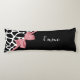 Una almohada de diseño con motivos en blanco y negro con una cinta rosada de color grisáceo atada a un lindo arco. Personalice este elegante diseño de impresión animal añadiendo su nombre. El lado inverso tiene un patrón gráfico de jirafa. Imagen plana impresa, no arco real.