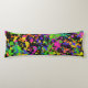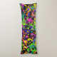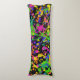 Esta divertida almohada tira salpicaduras de pintura en amarillo brillante, verde lima, naranja, verde azulado, azul violeta y rosa caliente. El fondo negro apaga los colores.