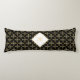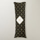 Una almohada corporal de lujo negra y dorada con un patrón floral quatre de cuatro puntas que se puede personalizar añadiendo su monograma. Este elegante diseño de damasco con monograma vintage seguramente hará que salga su lado sofisticado. Imagen impresa plana, no metálica.