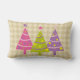 En un fondo de estampado a cuadros beige, este diseño de almohadas de bonito tiene árboles de Navidad rosados, púrpura y verde.