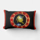 Esta almohada lumbar muestra la rueda de zodiaco Leo con signos celestes principales y de otro tipo alrededor de la rueda con un estilo y tema rojo y dorado en el panel frontal y posterior con tela de tejido suave sin arrugas y tiene un cierre de cremallera oculto que incluye un inserto sintético. Todas las almohadas están hechas de poliéster 100% con impresión doble cara de sublimación de alta calidad.