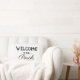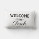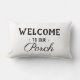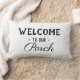 Bienvenido a nuestro texto personalizado Porch vintage rústico Lumbar Pillow texto negro, fondo blanco