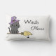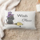 Un adorable gato negro con el gorra de una bruja y un palo de escoba con las palabras: "Bruja, por favor".